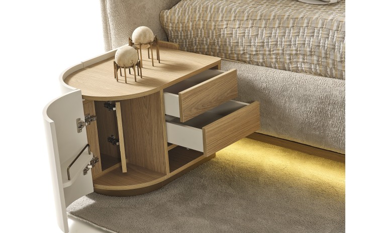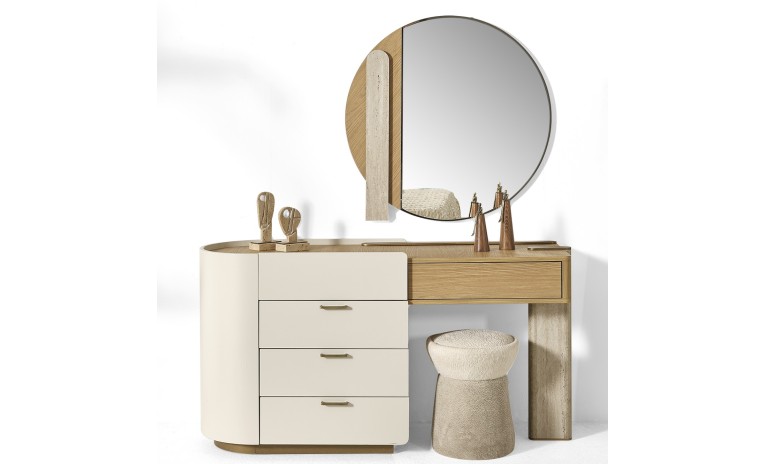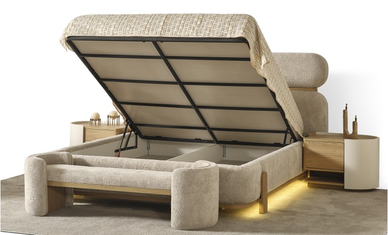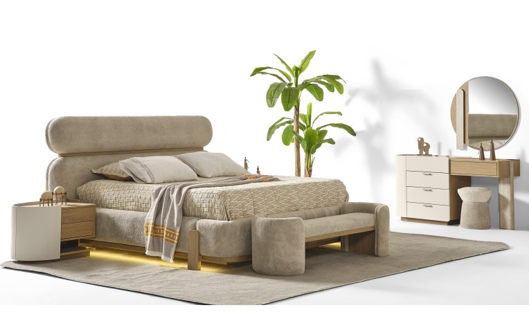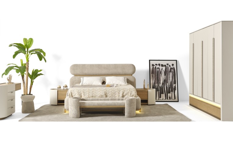 يجمع التصميم بين الخطوط العصرية البسيطة والتفاصيل النحاسية الراقية ليخلق أجواءً هادئة وأنيقة تعكس الذوق الرفيع وتحوّل غرفتك إلى مساحة مريحة تنبض بالأناقة والتميز.
