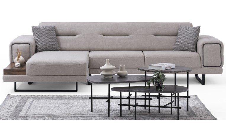 قم بتحسين مساحة معيشتك مع طقم جلوس مونتانا زاوية يسار (LHF). يتميز هذا الطقم الأنيق بمقاعد مبطنة بنسيج فاخر بألوان محايدة وبتصميم أريكة واسعة للراحة القصوى. يبرز تصميمه العصري بخطوطه النظيفة وطاولة جانبية خشبية مدمجة، مما يجمع بين الأناقة الراقية والراحة العملية.