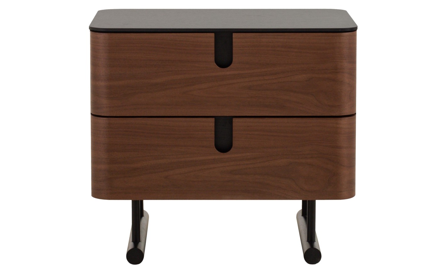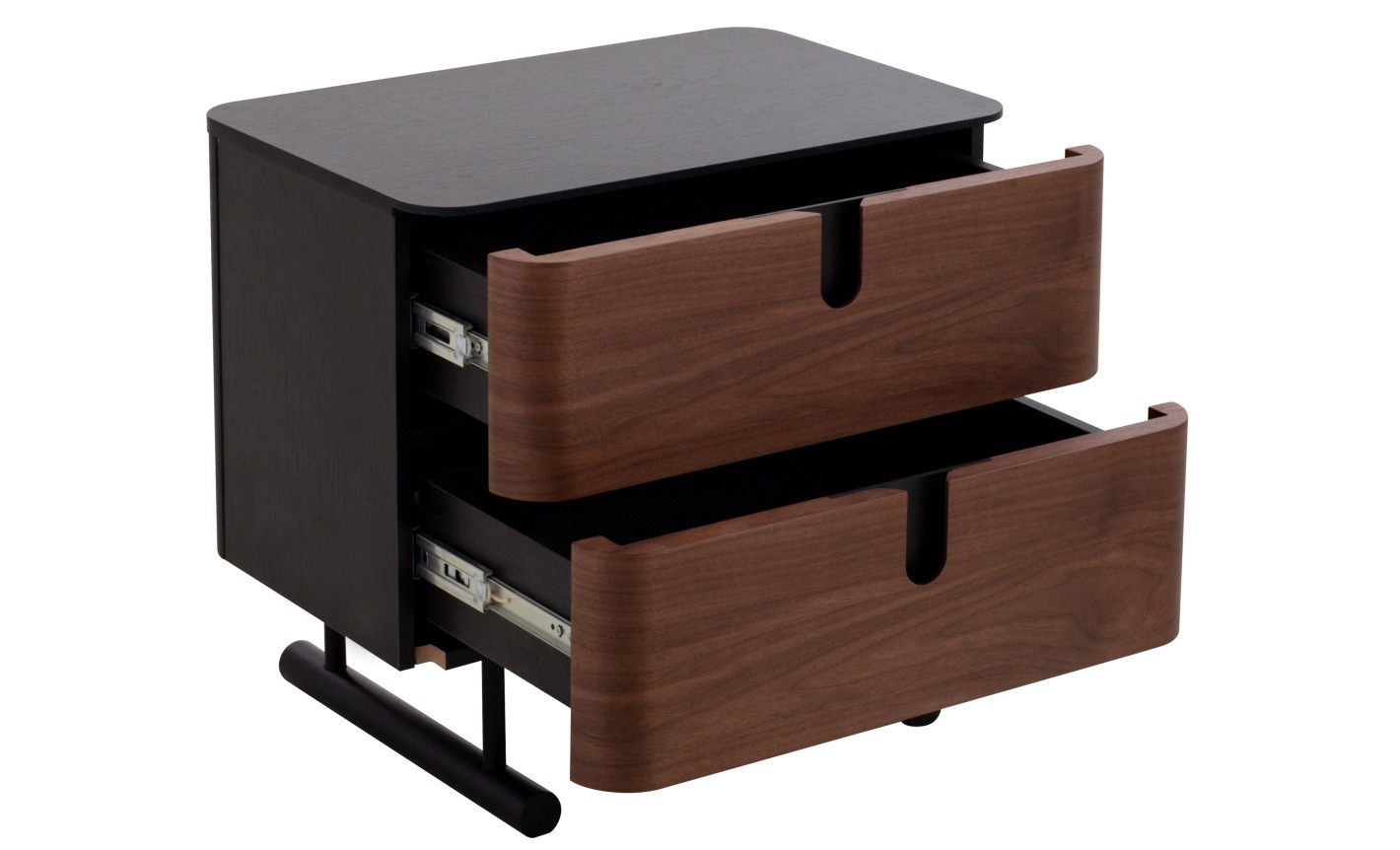 تجمع هذه الطاولة الجانبية ذات الدرجين من أثاث فهمي بين المواد الفاخرة والتصميم العصري بانسجام أنيق. تأتي بهيكل من قشرة الخشب الداكن يكاد يميل إلى الأسود، مع درجان أماميّان من خشب الجوز الداكن بتصميم منحنٍ متباين. يعتمد التصميم الخالي من المقابض على مسكات غائرة لمنح مظهراً انسيابياً، بينما تضفي الأرجل المعدنية الفريدة شكلاً عصرياً يوحي بأن الطاولة عائمة.