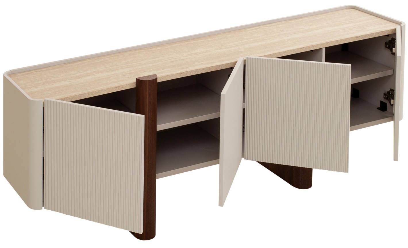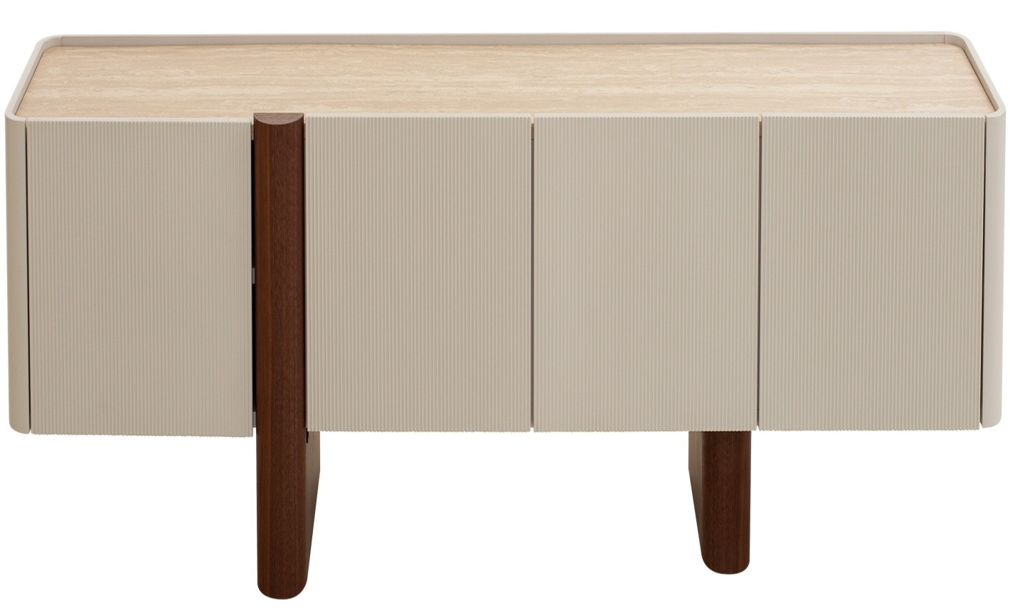 تُشكّل وحدة التلفاز هذه من أثاث فهمي نقطة محورية أنيقة في أي غرفة معيشة. تتميّز بسطح بتشطيب يشبه حجر الترافرتين الفاخر، يتباين بشكل جميل مع أبواب الخزانة المخددة بتشطيب مطفي باللون البيج أو الكريمي. وترتكز القطعة على ساق أسطوانية قوية من خشب الجوز الداكن تمنحها دعماً فريداً ومظهراً مميزاً.