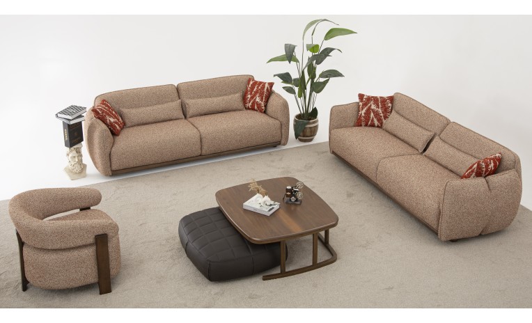 تمتع بأقصى درجات الراحة والأناقة العصرية مع طقم غرفة المعيشة فيرا. يضم هذا الطقم الجذاب أرائك ذات تصميم مستدير مبطّن بقماش دافئ وذو ملمس فريد، بالإضافة إلى كرسي بذراعين مريح. يُكمّل الطقم بوسائد ملونة بنقوش حيوية وقاعدة خشبية ناعمة، ليشكل مركزًا أنيقًا ومرحّبًا في غرفة المعيشة الخاصة بك.