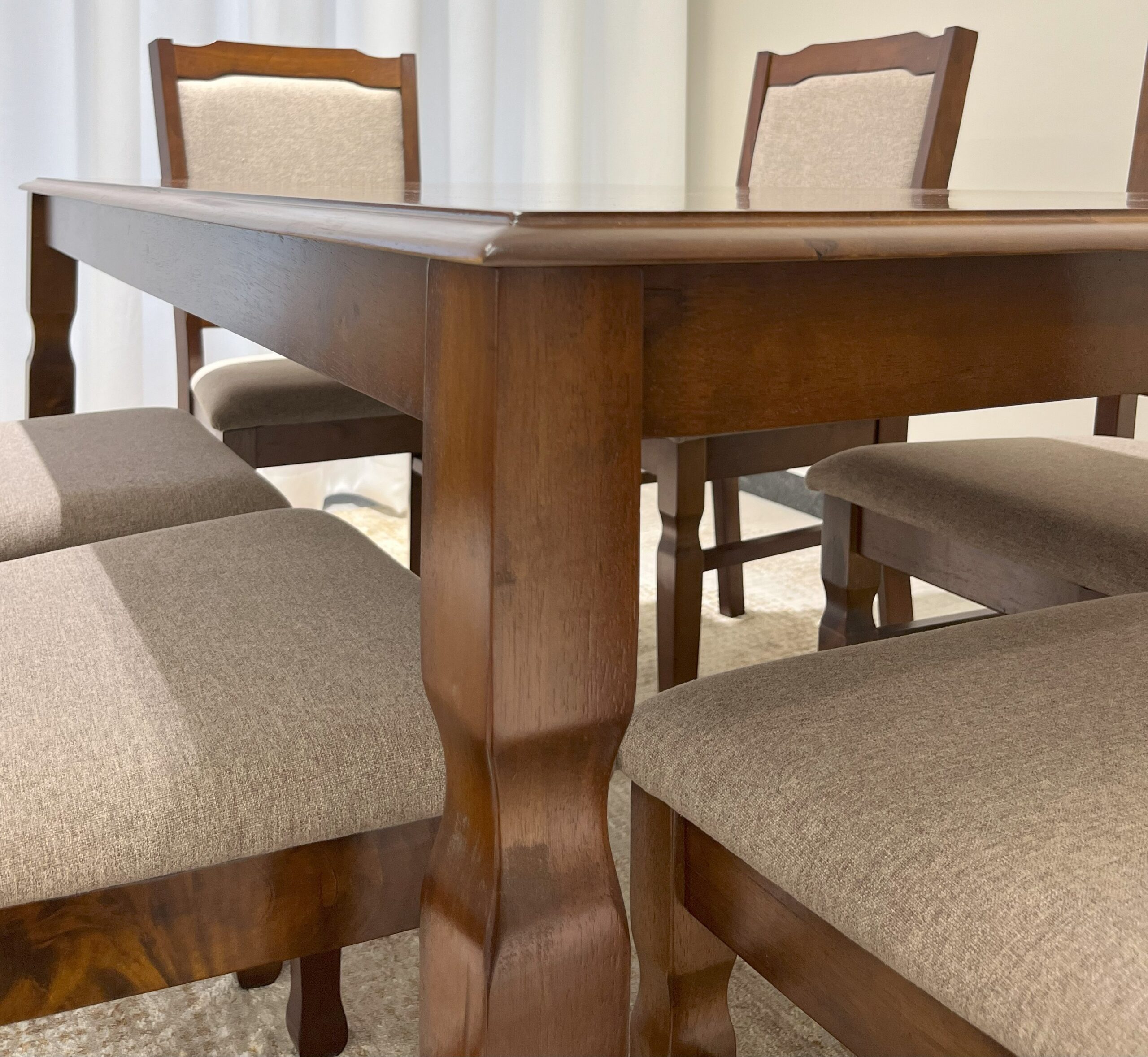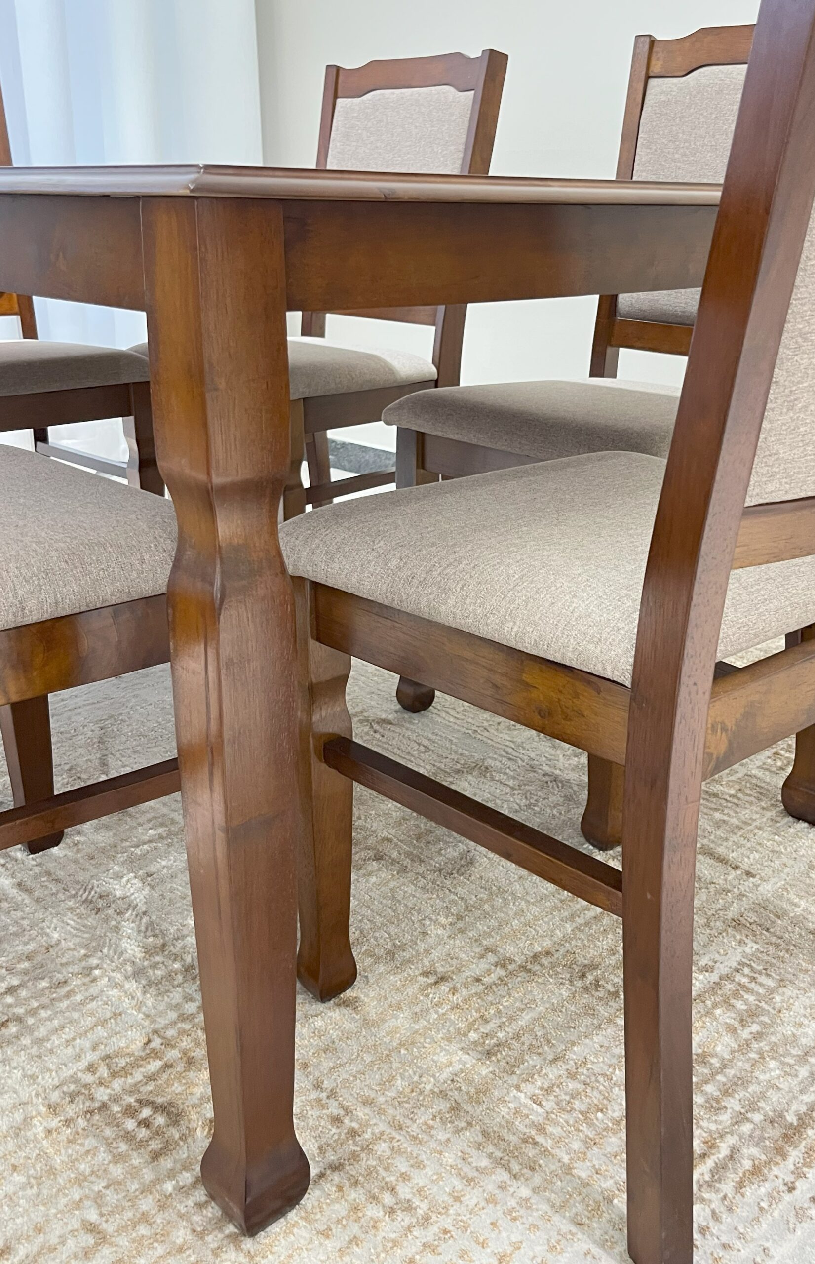 Create a warm and inviting dining space with this classic wooden dining table set. Featuring a rich, dark walnut finish and six comfortable upholstered chairs, it's perfect for family meals and entertaining guests.