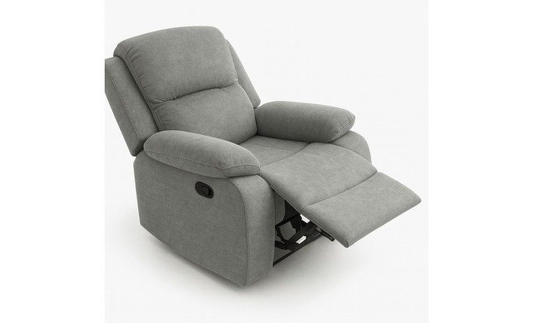 Relax completely in this cozy gray fabric manual recliner by Fahmy Furniture. Its classic design features a plush, overstuffed back and rolled arms for maximum comfort. Upholstered in a durable light gray linen-look fabric, this chair includes an easy-access side lever to fully engage the footrest and recline function. A perfect addition to any living room, den, or reading nook.