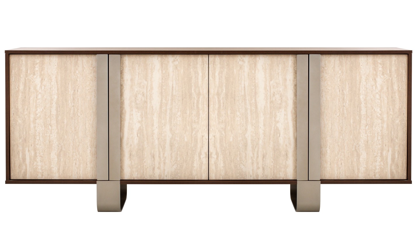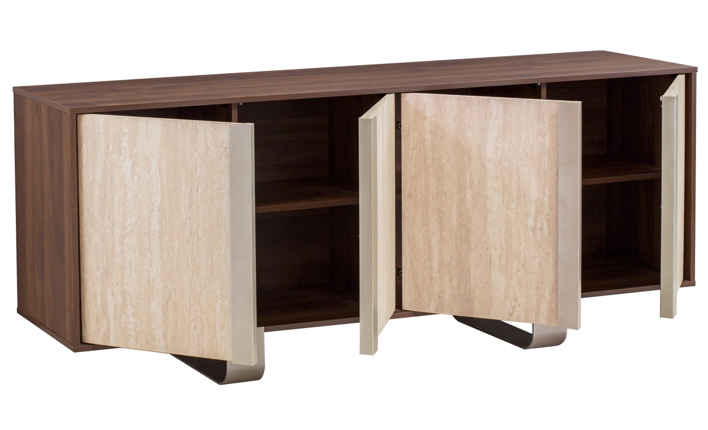 Make a sophisticated statement with this contemporary sideboard. It features a rich dark walnut veneer frame beautifully contrasted by four large light marble-look door fronts. The front is accented by striking brushed metal vertical straps and a unique, sculptural base.