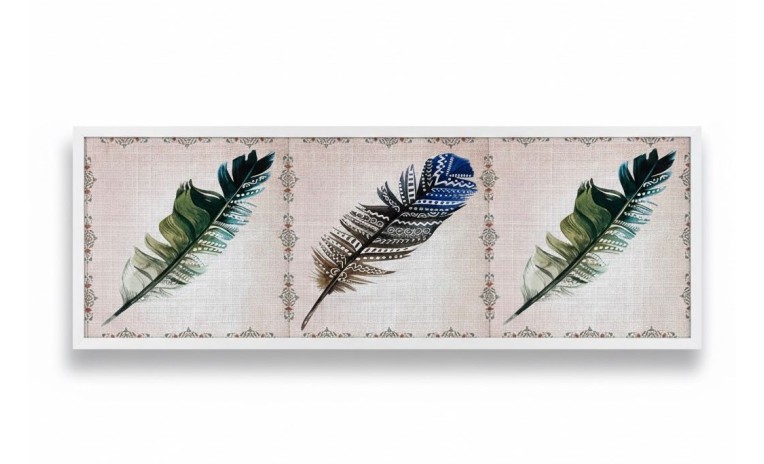 Add a touch of Bohemian charm to your space with this decorative wall art by Fahmy Furniture. It features three detailed watercolor feathers—two green, one blue and patterned—set against a soft, subtle tile-inspired background.